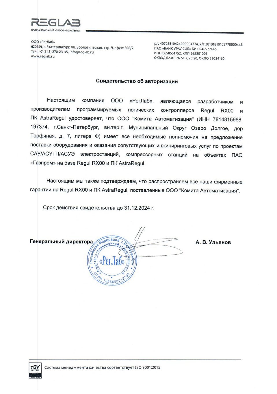 Получено свидетельство об авторизации ООО «Комита Автоматизация» для поставки ПЛК Regul производства ООО «РегЛаб» на объекты ПАО «Газпром»